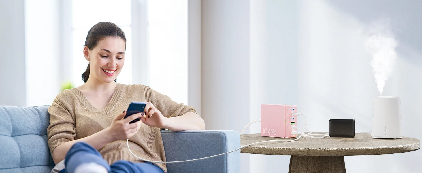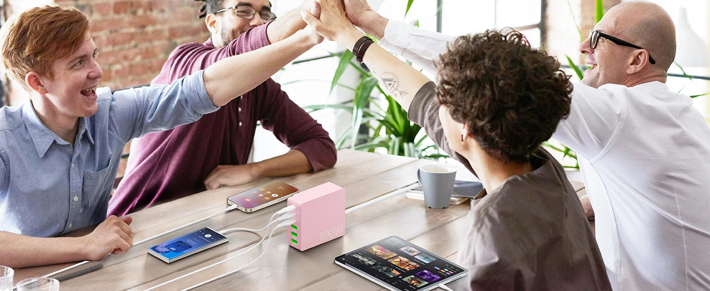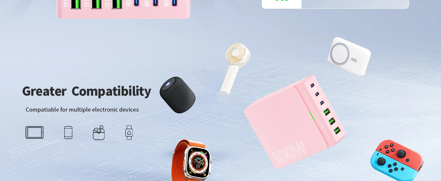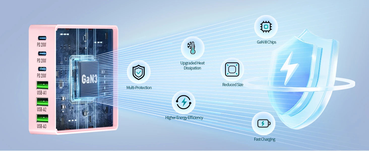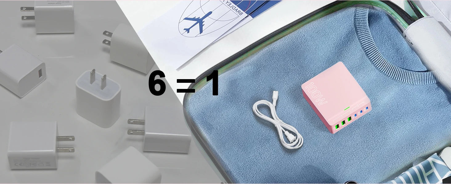 100W 6-Port GaN Quick Charge Hub - PD 3.0 Type C and USB A Charging Case - for Cell Phone Tablet Laptop